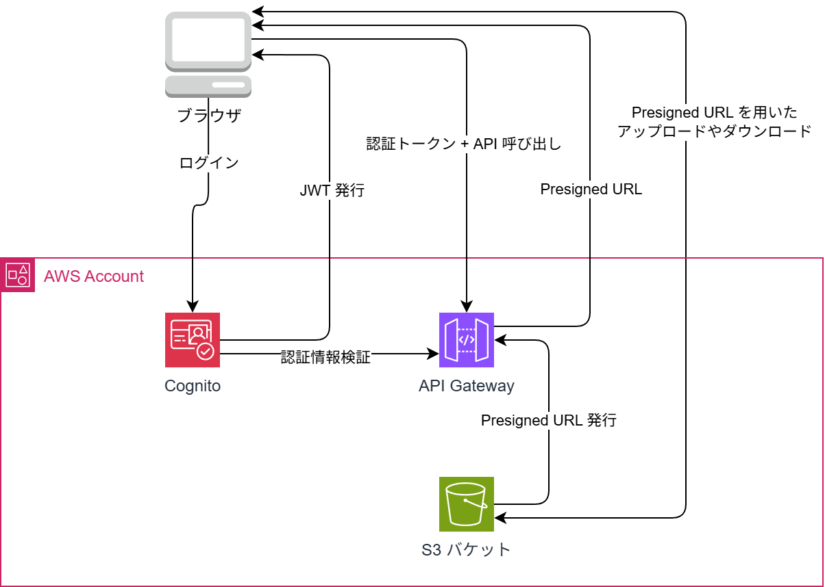 認証の大部分は Cognito で行い、 ファイル転送は S3 の Presigned URL を Lambda で発行してクライアントと S3 が直接やり取りする仕組みです。